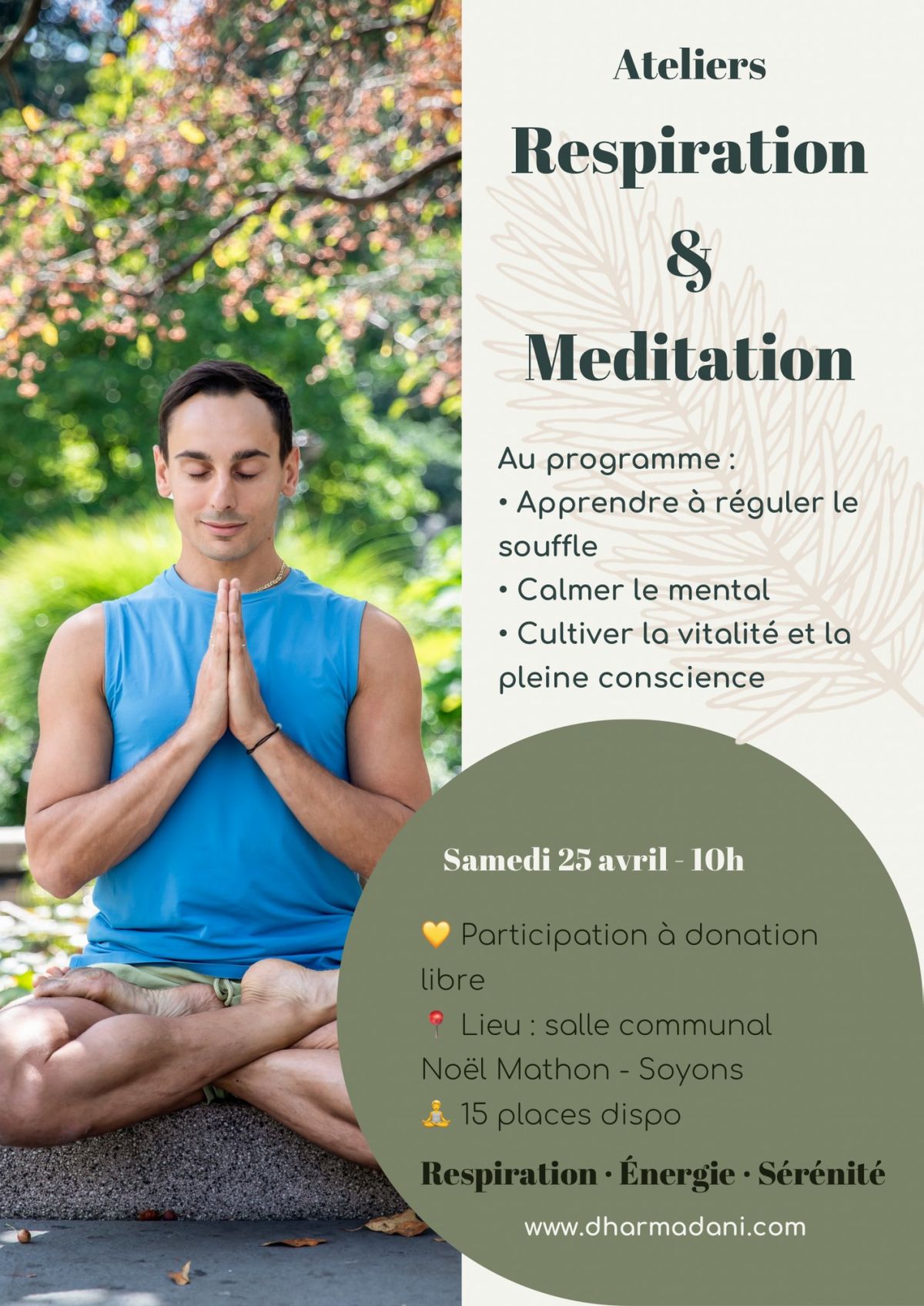 Daniele Salvitto vous invite à deux séances de pranayama et méditation le samedi 25 avril à 10h, ouvertes à tous les niveaux, débutants compris. Ces ateliers sont guidés selon la tradition qu’il a récemment approfondie lors de sa formation de 700 heures avec Sri Dharma Mitra.