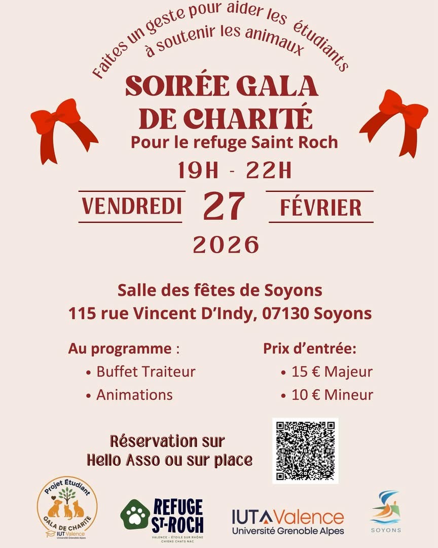 - Dans le cadre de notre projet étudiant, nous organisons un gala de charité au profit du Refuge Saint-Roch, situé à Étoile-sur-Rhône. Cet événement solidaire se tiendra le vendredi 27 février, à partir de 19h, à la salle des fêtes de Soyons.