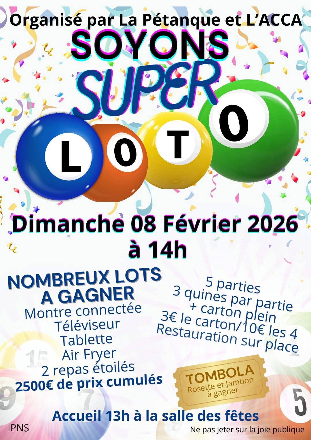 - Super Loto organisé par l'Association Communale de Chasse Agréée et La Pétanque Soyonnaise le dimanche 08 février à 14h, à la Salle des Fêtes André Comte.