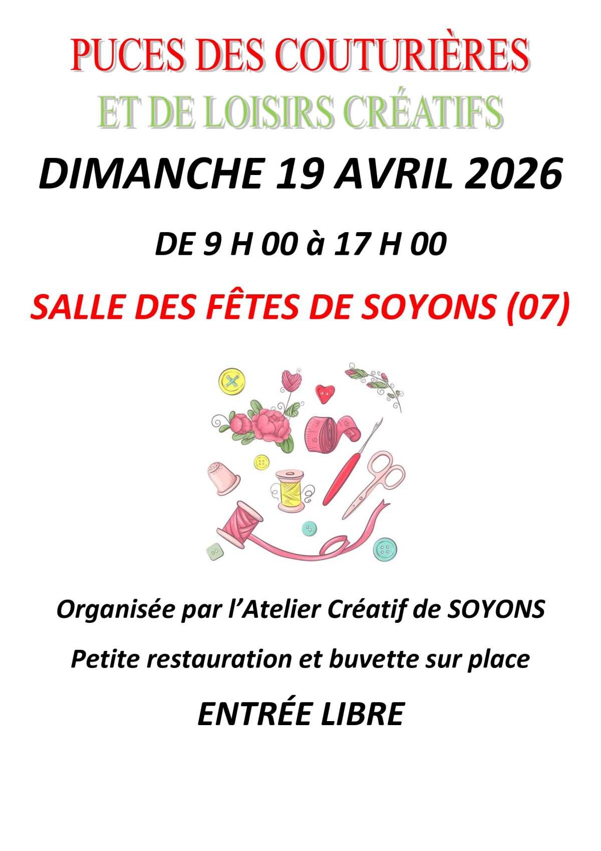 L'Atelier Créatif de Soyons vous invite à ses Puces de Couturières le dimanche 19 avril de 9h à 17h, Salle des Fêtes André Comte.
