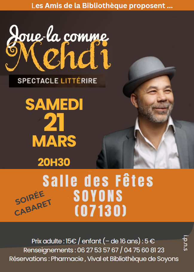 L'association "Les Amis d ela Bibliothèque" vous propose une soirée-cabaret avec le spectacle "Joue-la comme Mehdi" le samedi 21 mars à 20h30, à la Salle des Fêtes André Comte.