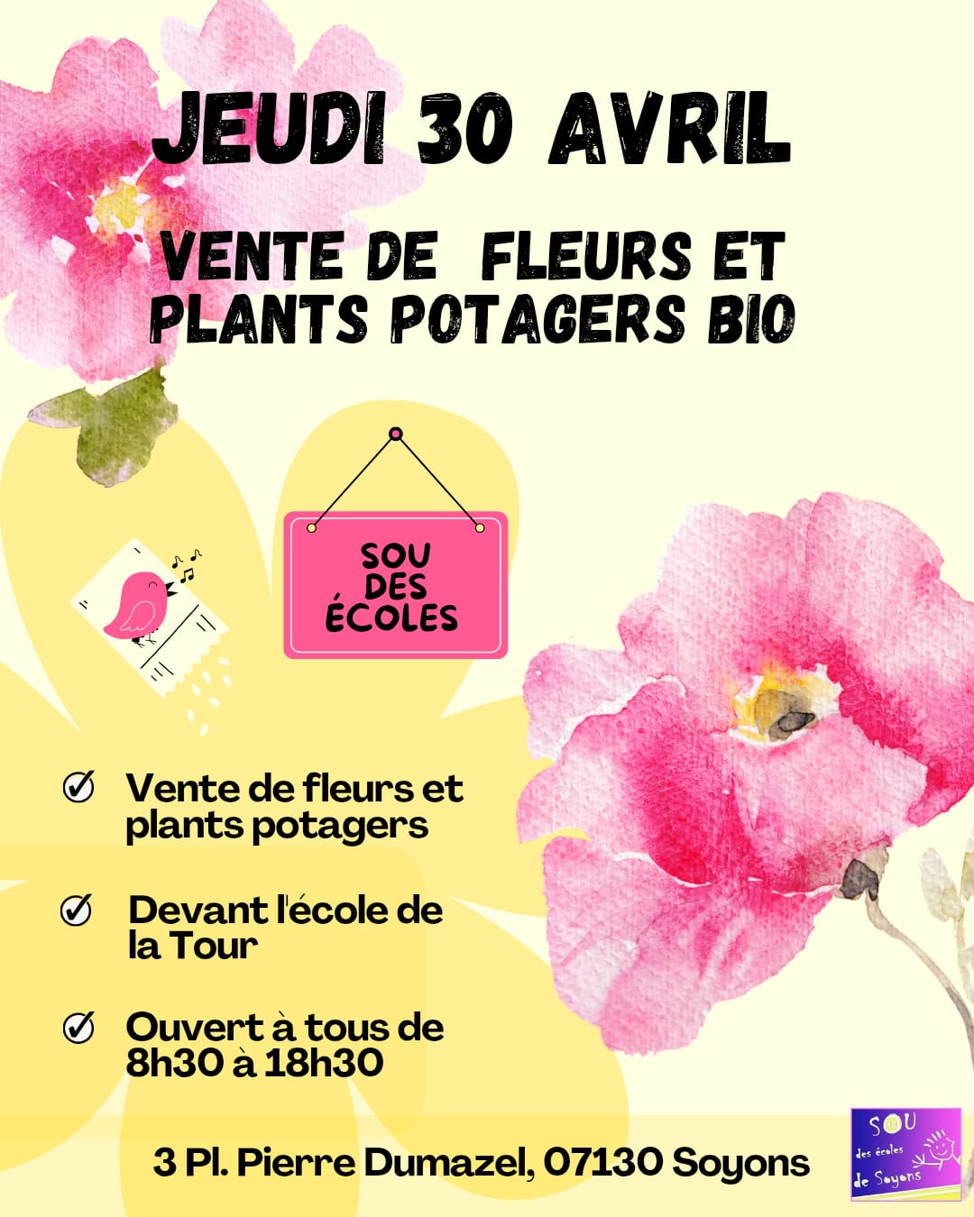 - Le Sou des Ecoles de Soyons organise sa traditionnelle vente de fleurs et plants potagers bio le jeudi 30 avril de 8h30 à 18h30, place Dumazel, devant l'école.